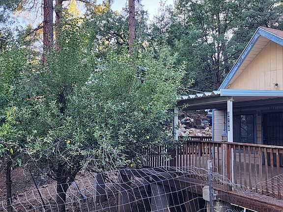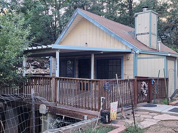 This cozy cabin has many possibilities. It offers 1 bedroom, loft, 1 bath and vaulted ceilings with wood beams giving you that cabin feel. Outside of the home there is a large covered deck for those that like to enjoy the tall pine trees and wildlife in the cool pines. Multiple mature fruit trees. This home has lots of potential. It can be a primary residence or a 2nd home. It needs love and vision. Home is being sold ''as is''.