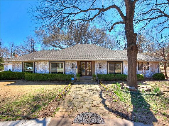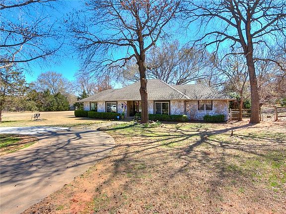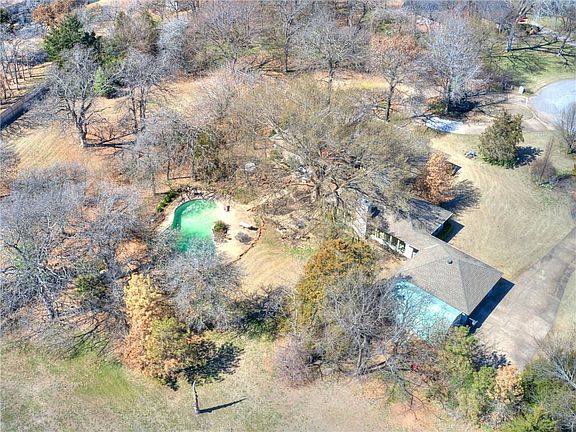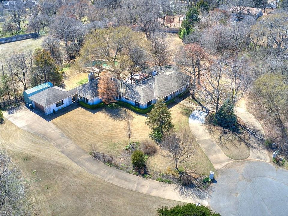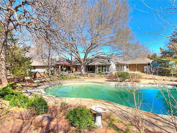 Acreage - in town - with pool & hot tub--This East Edmond hidden treasure is the place for you! On just over 2 wooded acres in private cul-de-sac sits the spacious single-story 3 bed, 2 full, 1 half bathroom home complete with 3 living areas & 2 dining areas. The Great Room is the coolest room in the house with two walls of windows for unparalleled views of the pool and acreage, a full bar with granite counter tops, stone fireplace, & plenty of room for multiple sitting areas. True master suite with separate sitting room, renovated bathroom w/ subway-tile shower and modern claw-foot tub, & windows throughout! The two additional bedrooms have nicely sized closets, ceiling fans, & access to shared full bathroom. Enjoy your private retreat from the extensive patio and lookout over the pool, hot tub, & gorgeous landscaping. Looking for a place to build a workshop or 2? You can here! 2 other outbuildings & 2 car garage offer more storage. Make this your own slice of paradise today!