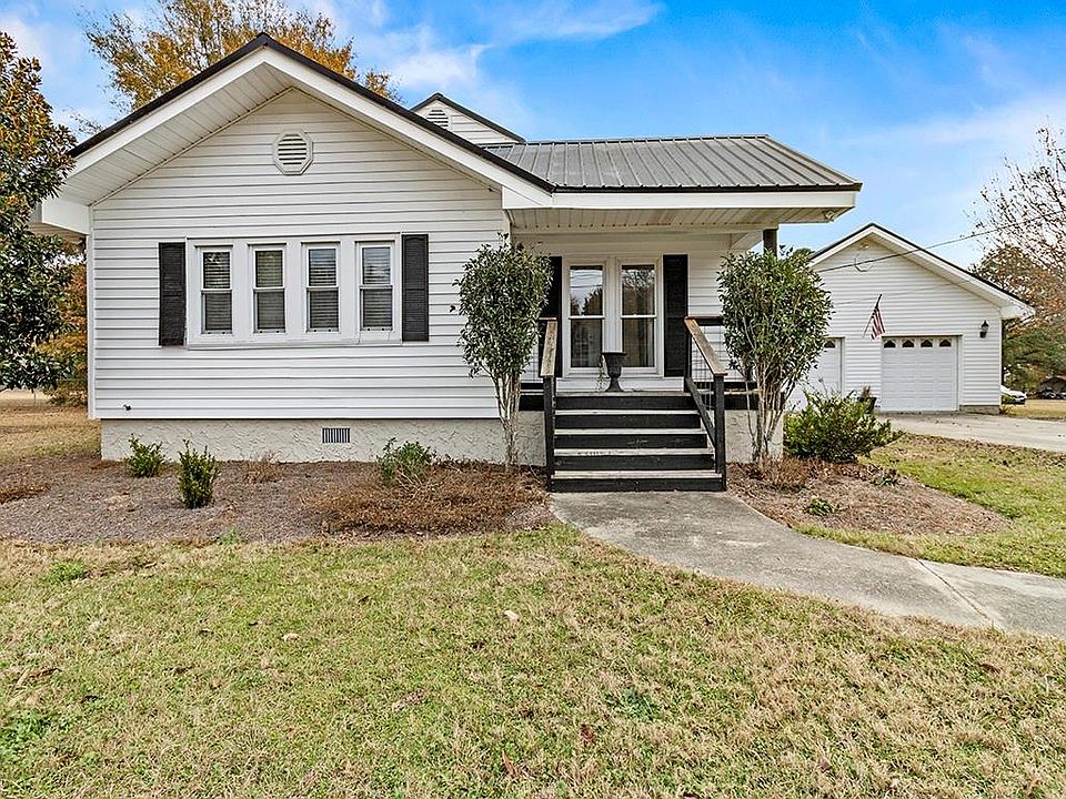 Welcome to this beautifully updated 3-bedroom, 2-bathroom home, nestled on a flat 1.46-acre lot. Built in 1950, this home boasts a blend of classic craftsman details and thoughtful modern updates, designed to match the original parts of the house perfectly. From the new front porch, step into your living room, where sunlight floods this cheery space from gorgeous original window casings. Move next into the dining room and kitchen, large enough for your dinner table and guests at the peninsula bar. This open-but-not-too-open layout lends itself perfectly to hosting all of your family get-togethers! More windows bring light and warmth to the charming, tidy kitchen. Just off the dining room you’ll find an additional space to utilize as an office, playroom, or even a potential fourth bedroom. The spacious 16x20 master suite is an amazing space to unwind, with a cathedral ceiling and French doors to the back deck overlooking the backyard. Sip your coffee and watch the sunrise from bed or your favorite cozy chair! The master bathroom, completely renovated in 2024, showcases classic subway tile, a sleek double-sink vanity, and contemporary finishes in the shower that perfectly complement the vintage feel of the home. The two other secondary bedrooms are both great sizes for guests and children to have their own private spaces. Both bedrooms have original heart pine floors under the carpet that could be stunning with a quick restoration! Sitting in between the secondary bedrooms is the second bathroom, preserving its 50’s charm with the original cast iron tub and new subway tile surround, adding a touch of nostalgia to the home. The expansive backyard offers endless possibilities: enjoy gardening in rich, loamy soil, toss the ball with your kids, start your mini-homestead, or create your own outdoor dream space! The septic tank is located on the side of the house, so this backyard would be perfect for an in-ground pool (or take advantage of the existing above-ground pool! For hobbyists or anyone in need of extra space, the two-car garage features a workshop with its own back garage door entrance, a ramp, and covered storage out back for all the extras—a dream for tinkering, crafting, or just relaxing. Upstairs, you’ll find additional storage space. Convenient to I-75/475, just minutes from a beautiful new community park with pickleball courts and playgrounds, yet tucked just far enough away from the city, you couldn’t ask for a better location. This home is a true gem, retaining much of its original charm while offering opportunities to make it your own. Don’t miss your chance to own this unique piece of history in the heart of Lizella!