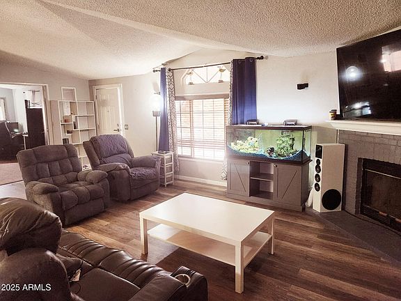 Price Drop! This spacious residence features a split floor plan with two large bedrooms and a versatile office or den. Enjoy seamless luxury vinyl plank flooring and fresh interior paint throughout. The updated kitchen and bathrooms blend modern touches with classic comfort, and a cozy wood-burning fireplace adds charm to the living space. Step out onto the expanded back patio—perfect for relaxing or entertaining—with no neighbors behind and stunning, unobstructed views of the Superstition Mountains. A large room addition with its own mini-split system expands your livable space, ideal for hobbies, guests, or extra lounging. This home has built-in storage, a separate workshop, and newer HVAC! This home is move-in ready.