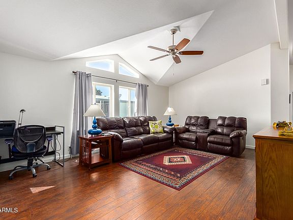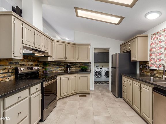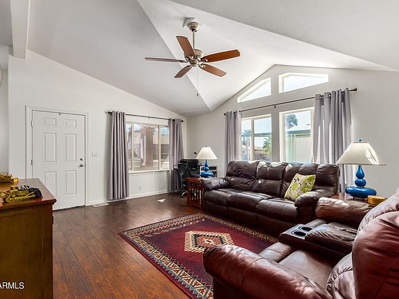 This home shows definite pride of ownership! This open layout boasts durable, beautiful 10mm laminate wood look floor, vaulted ceilings & accent windows for natural light. Updated kitchen features stainless steel appliances, updated counters, stainless single sink, slate backsplash, freshly painted cabinetry and bay window in the dining room. Large owner's suite features walk-in closet with mirrored wardrobe doors, an attached bath with a step-in shower and semi-frameless glass enclosure. Second bedroom has walk-in closet. Hall bath updated with frosted enclosure. Carrier HVAC 2018, LED lighting throughout, roof coated for energy efficiency. Laundry room w/cabinets, LG washer & dryer. Carport for up to 4 vehicles, 12x18 Storage! Blink cameras. Great 55+ community. More info on flyer photo