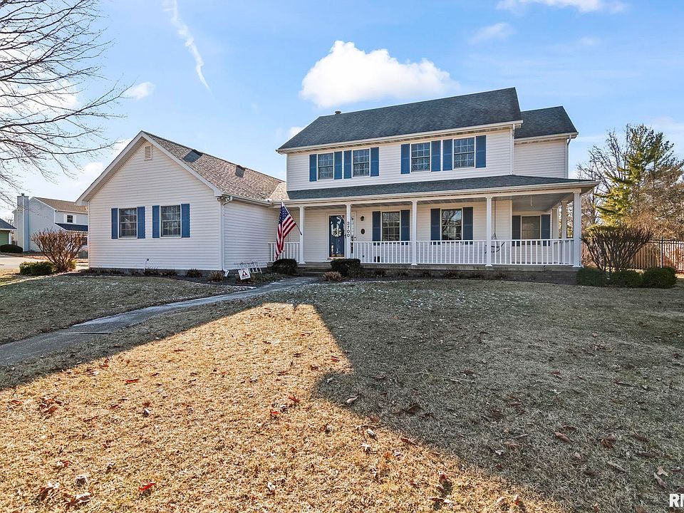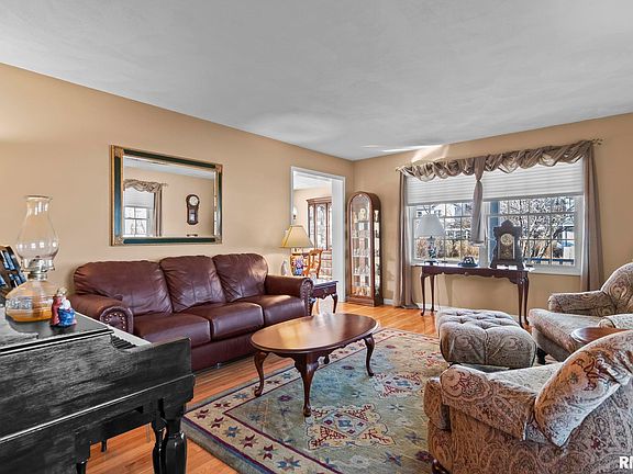 Spacious family home in Pleasant Plains school district and large covered front porch. Eat-in Kitchen has granite counter tops, desk area, serving area, pantry, stainless steel appliances plus a family dining room. Real hardwood floors (5-6yrs) in entry, hall, living, family and dining room. Family room has gas log fireplace. Large utility room with wash sink. Primary bath has oversized double bowl vanity, granite top, jetted tub, dual closets-both full and walk-in. Finished basement has 2nd family room with built-in entertainment center, recreation room, office with closet and additional bonus/storage room. Sludge pit in place for future bathroom. Heated garage with storage shelving. Privacy fence yard. Roof 12 yrs, Train Hi-eff furnaces 2019, A/C units 2018, newer 50-gallon water heater, whole house fan, alarm system, sprinkler system, battery back-up sump pump. Pool table and some personal property items are negotiable.