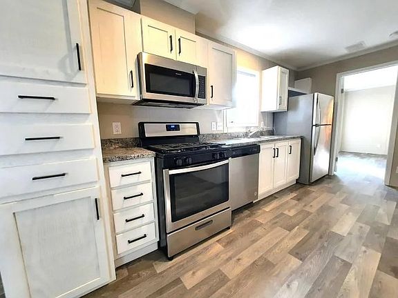 Welcome Home! Step into this beautifully crafted 2022 home, offering 3 spacious bedrooms and 2 modern bathrooms across 1,216 sq ft. As you enter, you'll be greeted by a large, inviting living room that's perfect for both relaxing and entertaining. The kitchen is a chef's delight, featuring lovely white cabinets that provide ample storage, paired with sleek stainless steel appliances that make cooking a joy. Retreat to your master bedroom, a sanctuary designed to comfortably fit a king-size bed. The en suite bathroom boasts a convenient shower-tub combo and a generous closet, perfect for organizing a large wardrobe. On the other side of the home, you'll find two additional bedrooms, ideal for family, guests, or a home office, along with a stylish guest bath complete with an above-the-toilet cabinet for extra storage. Step outside to your private oasis, where a large, beautiful tree provides ample shade, creating a perfect spot for outdoor relaxation and activities. This home is available for sale or rent, making it a versatile choice for wherever you are in life. Stop by the office or call today before someone else claims your new home!