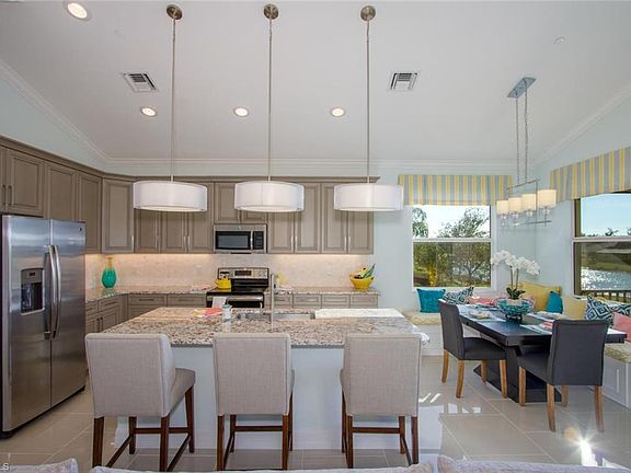 This is a must see never lived in, former Kolter Homes Heron model. The Heron design coach home is an upstairs unit and includes 3 spacious bedrooms, Dining/Den, breakfast nook & attached 2 car garage. What makes Kolter Homes different than other Builders is this home has 12ft Ceilings, 8ft interior Doors and Transom Windows for maximum natural light. The great room is open w/ Astona 24x24 White Tile throughout, 42- inch Alabaster Kitchen Cabinets, Magnific White Granite Countertops, Dal Tile backsplash, Stainless-Steel appliances and Crown Molding throughout. Sliding glass doors open out to the Tiled Screened patio w/ golf course view. The Master bedroom offers natural light w/ Coffered Ceilings golf views. The master bath w/ double Zodiaq Quartz Stratus White vanities, shower, private commode & large walk in closet. There are 2 more guest bedrooms sharing 1 bath room w/ Zodiaq Wild Rice Quartz countertops, Laundry Cabinets & Sink, Full Wet Bar w/ Magnific White Granite countertops. This coach home is new construction w/ Hurricane Impact Glass & comes w/ a home builder 2/10 warranty.