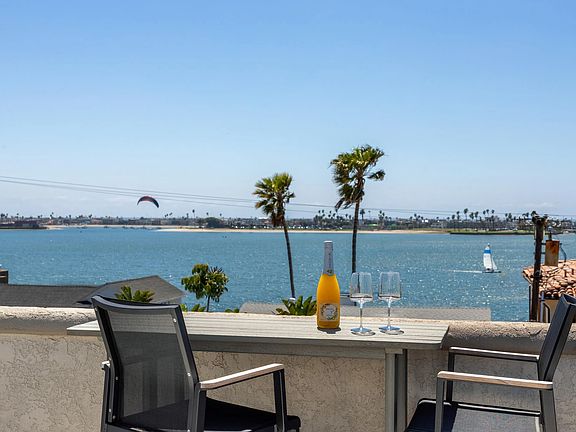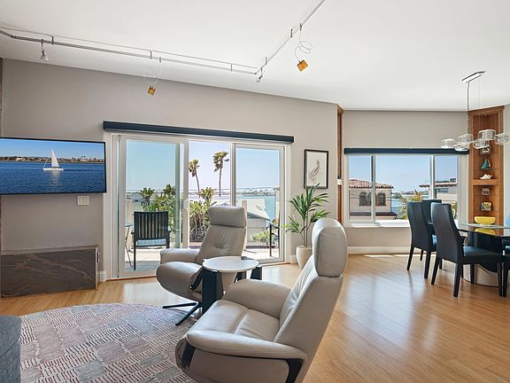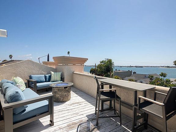 Step into effortless coastal comfort at this multi-level Pacific Beach condo, perfectly positioned just steps from the bay and a short walk to the beach. Designed for extended stays, this residence offers ocean-view living with a relaxed yet refined aesthetic throughout. The main level features a bright and inviting living area with plush seating, a cozy fireplace, and access to a balcony where you can enjoy a glimpse of the ocean beyond the palms. Upstairs, the spacious primary suite features a king bed, custom built-ins, a fireplace, and a private balcony with partial ocean views. The second bedroom offers a queen bed and built-in shelving, while the third bedroom doubles as a home office with a full-size Murphy bed, perfect for flexible use during your stay. Three full bathrooms are conveniently located throughout, all with tasteful, functional finishes. At the top of the home, the private rooftop deck offers a true escape, complete with comfortable seating, a fire pit, and panoramic views of the ocean and bay. Whether you're sipping morning coffee or watching the sun set over the water, this space invites you to relax and take it all in. Additional comforts include central air and heat, in-unit laundry, two parking spaces in the garage, and street parking available. With its unbeatable location, ocean outlooks, and thoughtfully designed layout, this Pacific Beach retreat is an ideal coastal home for an extended stay. This is a furnished seasonal rental. Pricing varies by length of stay and seasonality. Published amounts are range estimates only. Final pricing, fees, and availability are subject to change until a fully executed lease agreement. Please inquire for exact quote and terms.