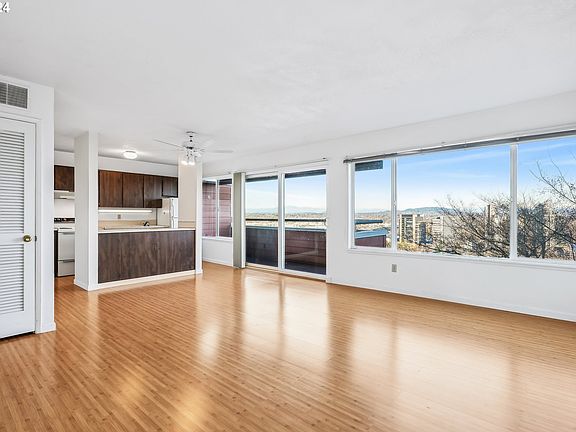 Nestled on the serene tree filled hillside just below OHSU, this timeless 1 bedroom, 1-bath condo offers an unbeatable combination of natural tranquility and city convenience. The unit boasts expansive views of downtown Portland, the South Waterfront, Mt. Hood, and Mt. St. Helens—all from the comfort of your living room and spacious private deck. Enjoy the sweeping vistas of Portland’s skyline, rivers, and mountains. This condo is bright & airy, as it has tons of natural light flow through the open floor plan. Durable bamboo flooring is light and bright and offers durability and beauty. The condo also has in-unit laundry, while a group laundry room is available, you’ll love the convenience of having your own washer and dryer. Ample Storage, includes a dedicated storage space in a separate building. Private Parking, comes with a designated parking spot, plus guest parking is available. The location can't be beat! Just steps from OHSU and the Portland VA Medical Center, truly walkable, this condo is ideal for medical professionals or anyone seeking a perfect blend of urban and outdoor living. Take advantage of easy access to the trails on Terwilliger Boulevard, Duniway Track, and lush wooded surroundings. Whether you’re enjoying a sunrise over Mt. Hood or the twinkling city lights at night, this condo is a haven of beauty and convenience. Don’t miss the chance to call this rare gem home!