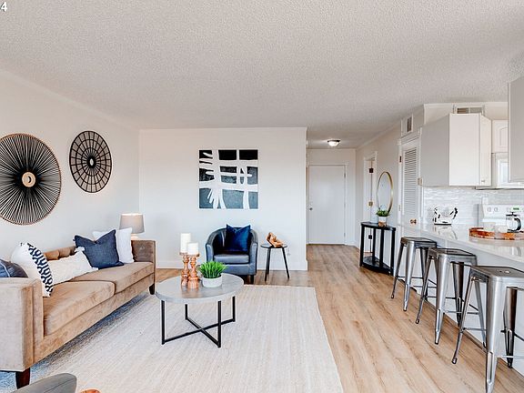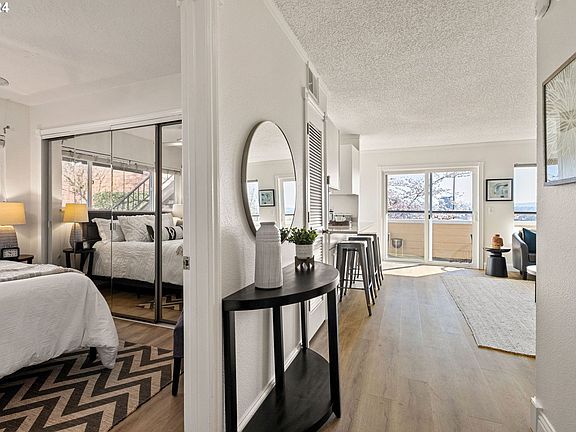 Stunning Condominium Offering Unrivaled Panoramic Views! Nestled amidst the serene, forested hillside below OHSU, this exquisite condominium presents breathtaking vistas of Mt. Hood, Mt. St. Helens, the Willamette River, Downtown Portland, South Waterfront, the Tram, and five picturesque bridges. Conveniently located a mere six-minute commute from Downtown Portland and within walking distance to South Waterfront's array of shops and restaurants, PSU, charming coffee shops, Lair Hill Park, and public transportation, this residence epitomizes modern urban living at its finest.Upon entering, the expansive walls of windows and sliding doors invite in abundant natural light, amplifying the spaciousness of the interior. The thoughtfully designed open floor plan creates a seamless flow throughout, perfect for both entertaining and daily living. This home features new luxury vinyl plank flooring throughout, quartz countertops, a stylish tile backsplash, and fresh interior paint.Step outside onto the covered deck and revel in the stunning vistas stretching before you. The exterior of the condominium has also been renovated, with new Hardie plank siding, vinyl windows, doors, and balconies, ensuring both aesthetic appeal and durability.For added convenience, this residence includes a deeded parking space and on-site storage, along with the convenience of an in-unit washer and dryer.