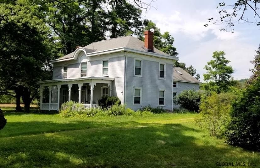 Gracious large Center Hall Colonial home on 5.3 ac features a welcoming front porch, stunning architectural detail, newly refinished gorgeous wide board floors and a horse barn with 6 stalls. Eat-in kitchen w Dutch stone hearth & crane. 2 large living rooms, formal dining room. Master suite. Laundry, possible br & full bath on 1st floor. House is early Dutch & English. Lovely property: mature trees, perennial gardens, berries. Perfect for the horse lover, animals in general. 1 acre fenced, add'l cleared acres. 3 outbuildings as is- significant historic English horse barn, workshop with concrete floor & I-beam for a hoist, small chicken barn. New Septic & leach field. Hoosic River. Near Battenkill FlyFishing, Saratoga, Troy, Bennington, Global Foundries. Cambridge Schools.