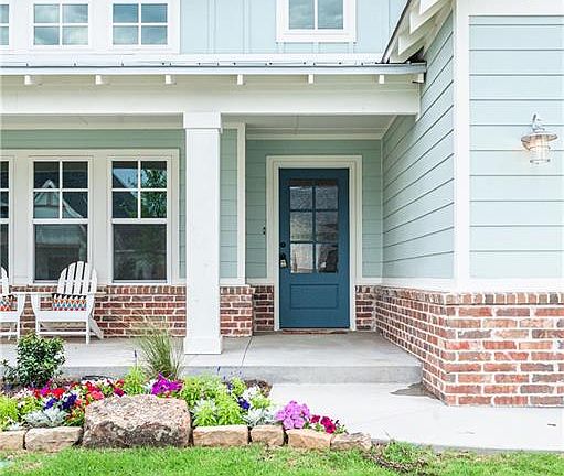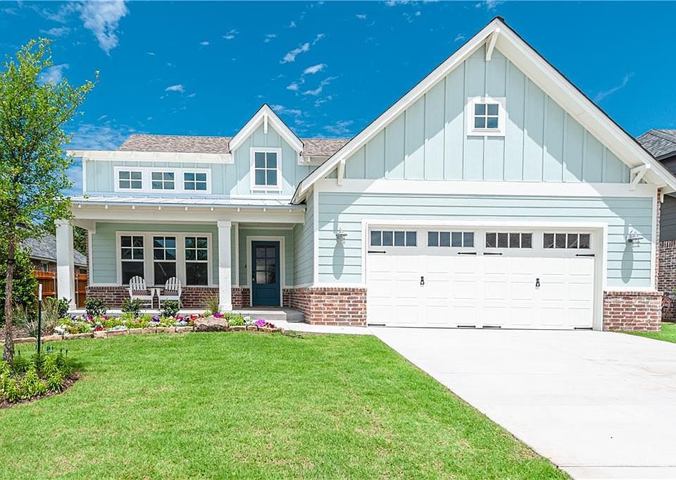 Living and relaxing are easy in this Modern Farmhouse home in Town Square! Your home will be perfect for your family gatherings with the spacious open concept living spaces in the kitchen, dining, and family room, which were made for entertaining. The living room features a vaulted ceiling with beams and a brick to mantle fireplace accented with vertical shiplap. The primary retreat has a tray ceiling, a freestanding tub, a large shower with a spa glass door, and a walk-in closet. This adorable home also has a private study on the front of the home with french double doors ad a 14ft ceiling. Home under construction - finishing late April/May. Town Square is Edmond's historically inspired community featuring a clubhouse, resort-style pool, fitness center, youth rec center, playground, community garden, wooded green belt with walking trails, and a lake with a fishing dock.