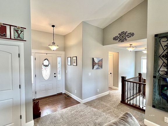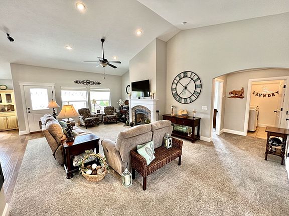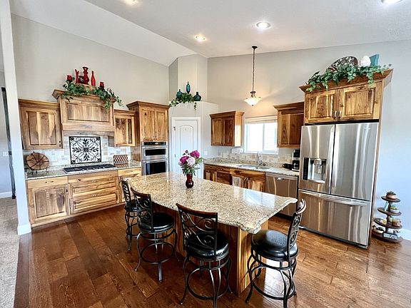 This stunning property sits on an oversized city lot, with beautiful landscaping in both the front and back yards. With 5 spacious bedrooms and 3 full baths. The interior features beautiful wood flooring, granite countertops, and a gas fireplace. Gourmet kitchen with upgraded appliances such as a 5-burner gas cooktop, wall oven, custom walnut cabinets and a pantry provide ample storage space. The oversized island is a focal point, with custom pullout trays for both trash and recycling. The master suite has a large mud-set tile shower with 2 shower heads, one being a rain head. The master has separate access to the back deck where the hot tub is located. One of the lower rooms is an ideal location for a large office, complete with built-in bookshelves and lighted display case. The 1,000 sq. ft. heated garage has 3 bays, with built-in wood cabinets and epoxy flooring. Enjoy a lovely view of the Ruby mountains from the comfort of your private backyard. The backyard features a stone fireplace, waterfall, covered patio, large paver patio, walkways, storage shed and outdoor kitchen. RV owners will appreciate the available RV parking with a 30-amp breaker.