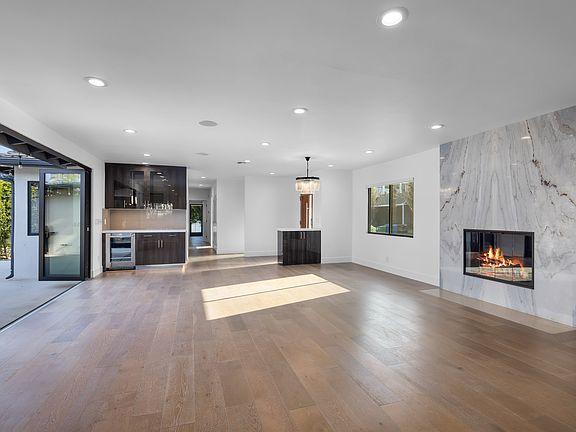 Welcome to this stunning, fully remodeled contemporary home situated on a desirable corner lot in prime Studio City. Designed for modern living, the bright and airy open floor plan features a spacious living room highlighted by a gorgeous bookmatch fireplace and accordion door that opens to extend your living space outside. A culinary enthusiast's dream, the gourmet kitchen is equipped with top-of-the-line appliances and an oversized waterfall island with ample seating. The main living space is completed by a formal dining area and chic bar with a built-in mini fridge. Enclosed by privacy hedges, the serene backyard retreat features an expansive patio, cozy hot tub and lush grassy yard, making it perfect for both relaxing and entertaining. This home has three generously sized bedrooms, including an impressive primary suite that boasts a custom walk-in closet and spa-inspired bathroom, complete with a soaking tub, rainfall shower and double vanity. Additional amenities include a laundry closet and two-car garage. This excellent South of the Boulevard location is only moments away from Ventura Boulevard's vibrant shopping and dining scene, and offers easy access to the Valley, Westside and Downtown LA.