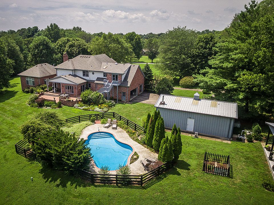 REDUCED TO SELL! Come see this quiet retreat with great entertaining flow inside and out! Located in the sought after North Oldham Co. school system! This home has a great room with an impressive fireplace and custom cabinetry. There is an updated kitchen with open, reclaimed wood shelving, a hand-crafted reclaimed wood 7-foot island with seating and abundant cabinets and granite counters. Nearby is a sunny breakfast room with views of the brick terrace and rear yard. In 2006 a first floor wing was added to accommodate a master suite with separate heat/air, laundry, walk in closet and en suite bath. There is a cozy bricked courtyard located off of the master suite. Upstairs you will find the original master bedroom and bath. Off of this master suite is an office area with an entrance by way of exterior steps. There are two additional bedrooms that share a Jack-N-Jill bath which completes the second floor. The basement has a family room with fireplace, wet bar, a full bath, and two additional rooms. One with a closet and egress to the attached garage, the other a storage/workshop room. The expansive brick terrace and covered patio with slate floor and skylights are relaxing areas to chill. Then there is a party pavilion with lights and ceiling fans near the in-ground pool. Off of the pool area there is an arbor-covered stone patio. The home has a 3-car attached garage and a detached Morton building with drywall, air conditioning unit, wood burning stove and parking for two vehicles. There is a home generator (Guardian 17kw natural gas) and invisible fencing that encompasses all non-wooded area in the backyard of this 4.5 acre property. Please note it is a quick 10-minute drive to Prospect, Crestwood or the Paddock Shops.