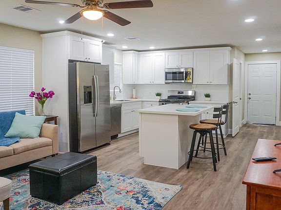 This beautifully renovated, fully furnished 1-bedroom home blends style and comfort. It features new central A/C and heating, flooring, cabinets, countertops, sinks, toilet, tub, and stove. The home comes equipped with an in-unit washer/dryer, refrigerator, cookware, dishes, bedding, and furniture, making it move-in ready. Located in a secure, gated property near the East River development, it offers quick access to I-10 and I-69, just minutes from healthcare facilities and attractions like Discovery Green and Downtown Houston. Ideal for traveling nurses, digital nomads, and those in transition, the property is available for short-term rentals with a minimum stay of 1 month. Includes yard maintenance. No pets and no smoking are allowed. Corporate housing inquiries welcome, & security cameras installed on-site for added peace of mind. Enjoy hassle-free living experience in a vibrant location! Shorter term lease with utilities plus internet included option available for additional rent.