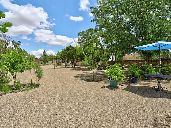 Welcome to your own private backyard sanctuary! This extra-large lot features lush landscaping, fruit trees, peaceful walking paths, and plenty of space to relax, play, or entertain. Enjoy backyard access, RV parking with hookups, and room to create your dream outdoor lifestyle. Inside, the home is beautifully updated with a bright, open floorplan, two spacious living areas, and a cozy custom fireplace. The kitchen is a chef's delight with updated counters, abundant cabinetry, and a separate cooking area. Updated flooring throughout adds warmth and style. The primary suite offers a peaceful escape with direct patio access. A rare find in Rio Rancho with so much indoor and outdoor living space to enjoy!