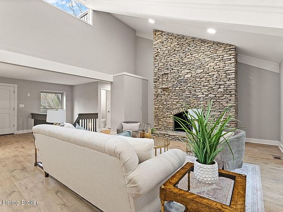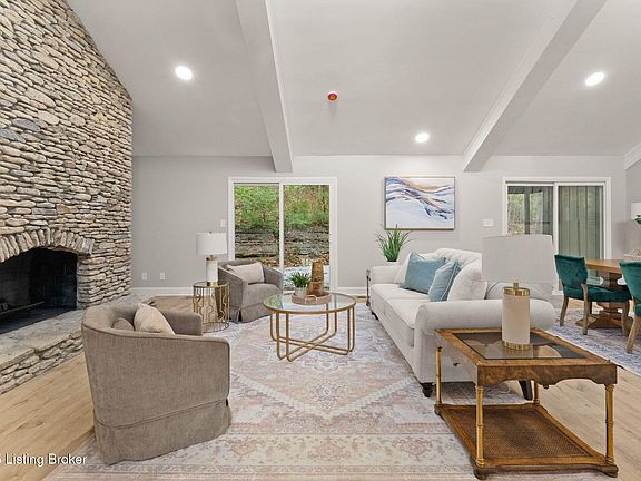 Spacious 5-bedroom, 3.5-bath home in Prospect offering generous living space and beautiful rear views. The main level features a living room with a floor-to-ceiling stone fireplace and two sliding doors—one opening to a covered screened patio and the other to a concrete patio—providing excellent indoor-outdoor living. The updated kitchen includes granite countertops, two pantries, and a breakfast nook, with an adjacent dining area. The primary suite offers patio access, a walk-in closet, and a tiled shower with dual heads. Two additional bedrooms, a full bath, and a half bath complete the main level. The finished basement includes a large family room with an oversized brick fireplace, two bedrooms, a full bath, storage, and dual staircases. Seller is a licensed broker in IN and KY
