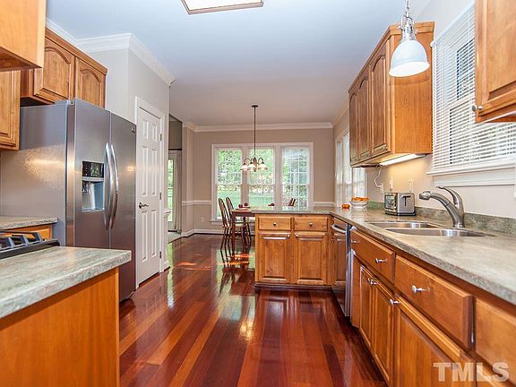Attractive Home sits on .48 acre lot with 1st Floor Master Suite, 3 beds/2.5 baths. NEW:gas range, SS appliances, faucet, sink, counter tops,interior,paint, storm door, all new toilets. FEATURES: crown molding, chair rail, Cherry Brazilian floor, recessed lighting, ceiling fans, pantry; family room w/fireplace, open to above; spacious bedrooms, bonus room w/closet. Manicure landscaping, private back yard w/large new sunroom and stone patio great for entertaining, walking distance to Neuse Trail. Well Maintained Home!