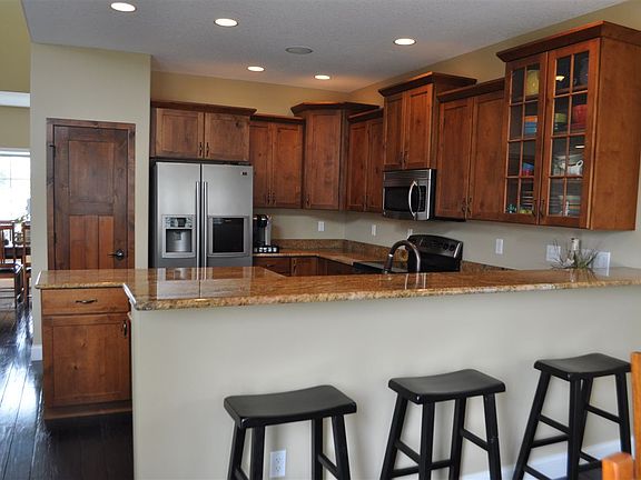 East side w/out ranch style home is a must see! Builder's home w/quality & care! This traditionally designed ranch home has an open arrangement w/formal dining, decorative columns,light filled lvg room w/transom windows, gourmet kitchen w/island, breakfast bar, & open eat in area, including hand scraped wood floors, 5 bedrooms, office, theater room w/whole house sound syst. LL bar. All granite tops. White woodwork. Heated garage, garden garage & professional landscaping complete this one of a kind home!