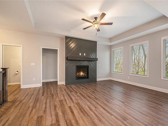 Indulge in luxury with this stunning reverse home boasting custom upgrades throughout! Bask in the natural light of the family room featuring a cozy fireplace. The kitchen offers quartz counters, a center island, walk-in pantry, top-of-the-line black stainless steel Samsung fridge, and upgraded appliances that stay. Relax in the large master suite with a walk-in shower, dual vanities, and a spacious walk-in closet with built-ins. Enjoy the convenience of a master-level laundry room with tile flooring and storage. Upgraded blinds adorn all the windows. The finished lower level is pre-plumbed for a wet bar/kitchenette and includes two additional bedrooms with walk-in closets and a full bath with a shower/tub and tile. Grill out on your own back deck overlooking the MASSIVE backyard with a privacy fence that backs to nature. Home also offers a ring doorbell, nest thermostat, upgraded smart watering sprinkler system already installed! Garage has a hot-water faucet and two electric vehicle charging outlets! When built, UPGRADES galore added throughout. Situated on a cul-de-sac, this home also offers access to the neighborhood pool and trails for added enjoyment and is close to conveniences!!