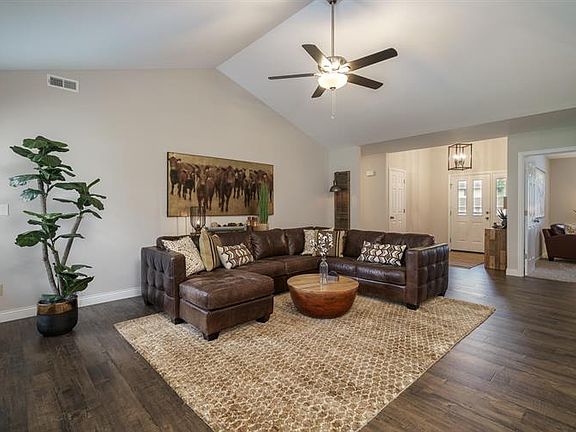 Awesome outdoor living space with new wood privacy fence, fireplace and TV. Open concept floor plan in family friendly neighborhood. Large family room with gas fireplace. Enjoy the open kitchen with stainless steel appliances, granite countertops, lots of counter space, and natural light. Master bath features dual vanities, soaker tub, and separate shower. Conveniently located near shopping and dining.