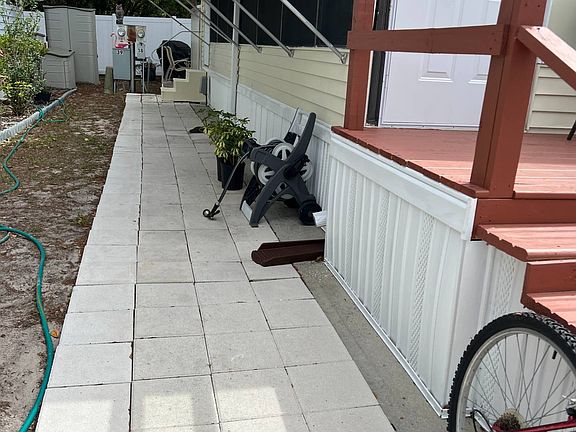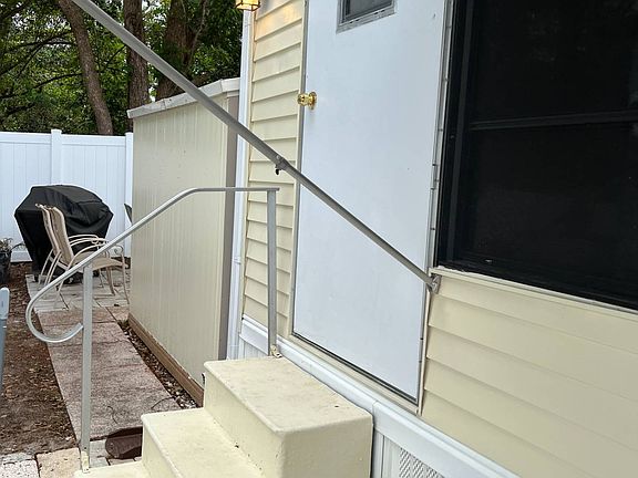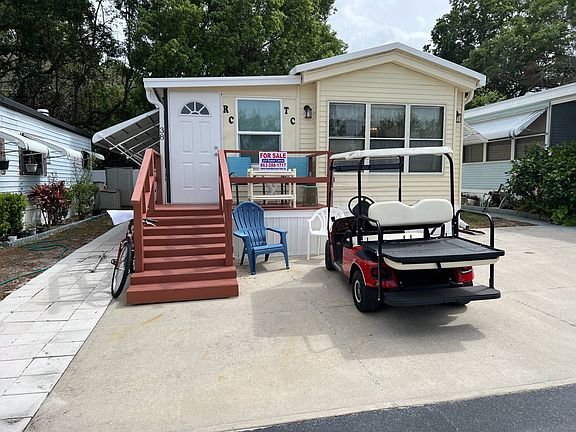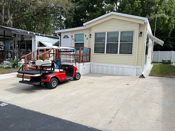 This is a quaint 1986, 680 sq ft, furnished, one bedroom and one bath park model home. Located in Hunters Run a 55+ community in Zephyrhills, Florida. When entering this quaint and updated home, you will enter into the closed in sunroom that can be used for extra living area. The sliding glass doors opens up into the open floor plan of kitchen and living area. The kitchen has a new electric stove and microwave. Laminate flooring is throughout the home. The bedroom is located in the back of the home with an updated bathroom that has a walk-in shower. The washer and dryer are conveniently located in the home. There is a back patio, slightly secluded, where you can have a barbeque using the grill that is also included in the sale of the home. Two sheds for extra storage. There is a beautiful golf cart that is also negotiable. This home will not last long so make an offer today. Park amenities include pool, hot tub, shuffleboard, exercise room, Bocce ball and community activities. The lot rent of $380 is to be verified through park management by the buyer. Land is leased only.