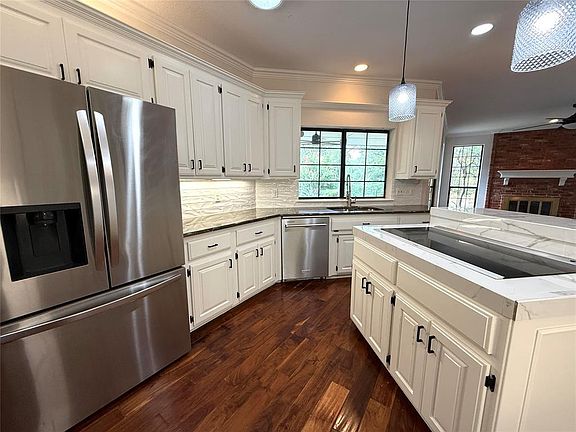 The open-concept living, dining, and kitchen areas create a bright, inviting atmosphere ideal for everyday living and entertaining. The spacious living room features a cozy brick fireplace, fresh paint, and plenty of natural light.