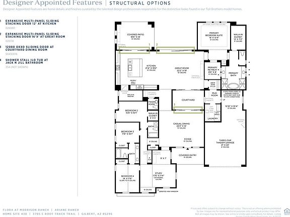This beautiful home was crafted for the way you live. Featuring a ranch-inspired covered entry, opening up a home design that is bright and airy. Greet your guests in a welcoming casual dining area that provides a convenient and intimate setting with views of the atrium, great room, and backyard beyond. The open-concept kitchen and great room provide the ideal space for entertaining. The gourmet kitchen makes a statement with its premium finishes, upgraded stacked cabinets with door hardware, gorgeous countertops, Sub-Zero refrigerator, Wolf stainless steel appliances, and 12 sliding glass door to the covered patio. The great room is the perfect setting for relaxation with its beautiful shiplap accent wall and ample natural light from the 16 multi-panel sliding glass door. The centrally located atrium features a sliding glass door and offers a cozy setting for outdoor living. In this home you can create just the right space for everything that matters with a study space, ideally located, that offers unlimited possibilities. Sizable secondary bedrooms feature en-suite bathrooms and ample closet space. The primary suite is in the back of the home for a more intimate, private setting. A luxurious primary bathroom boasts quartz countertops, split dual sinks, a large walk-in shower with two shower heads, a private toilet area, and a spacious walk-in closet. Highlights of this home include upgraded cabinets, upgraded countertops, beautiful flooring throughout, expansive sliding g