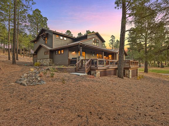 Luxury Flagstaff Ranch Mountain Home overlooking the 15th fairway has 4 bedrooms/3.5 baths with 3008 SF and primary bedroom on main with fireplace and doors to outside covered Trex deck. Built in 2017, it has all the upgrades including, remote control blinds, security system, 2 fireplaces, guest suites and separate upstairs living area, gourmet kitchen with beautiful granite counters, stainless appliances, gas range, and a walk in pantry. The great room has 20' ceilings, hardwood floors, gas fireplace, skylights and ceiling fans. The 3 car extended garage has custom built in cabinets and the floor is epoxy sealed. The property has been professionally landscaped with sprinkler system, lights and paver driveway. Perfect lock and leave, furniture available on separate bill of sale.