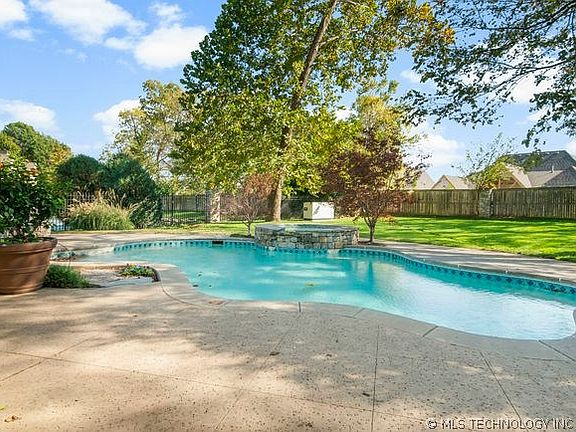 Gorgeous custom built home in Estates of Waterstone. Peaceful setting with pond view & outstanding outdoor area including pool, hot tub, covered living w/fireplace. Open plan w/arched windows & doors, detailed woodwork. Chef's kitchen w/Viking appliances * espresso station. Office/2nd bedroom down. Gameroom plus 3 beds up. JENKS SE.