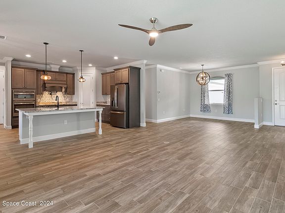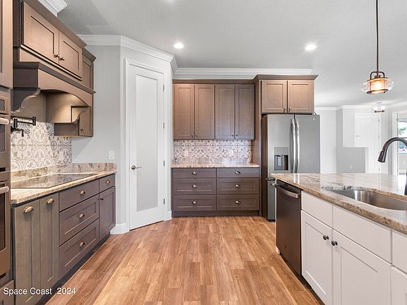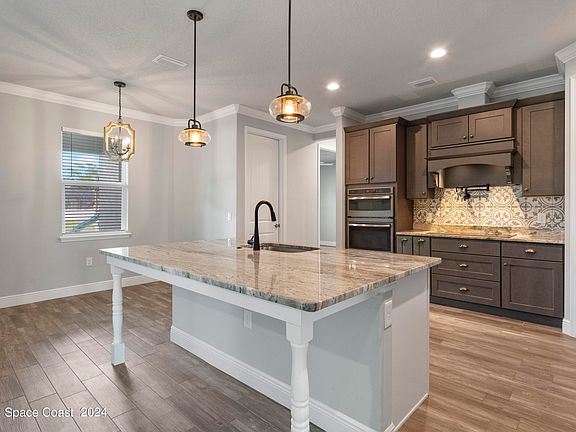 Welcome to this exquisite 4-bedroom plus office, 3-bathroom home on a half-acre lot in the prestigious Carriage Gate community. Built in 2020, this modern gem boasts an open floor plan accentuated by elegant wood tile plank flooring throughout. The gourmet kitchen is a chef's dream, featuring a spacious island, double ovens, a pot filler, and stunning granite countertops. The primary suite offers a luxurious retreat with a curbless shower, dual sinks, and his and hers closets with custom built-in shelving. Additional highlights include a 3-car garage, a well-appointed laundry room with a sink and folding area, a fenced-in yard, and a charming porch perfect for outdoor relaxation. Ample storage is available throughout the home, including attic flooring that has already been installed. Don't miss this opportunity to own a beautifully designed home in one of Melbourne's most sought-after neighborhoods.