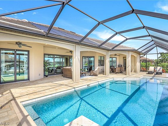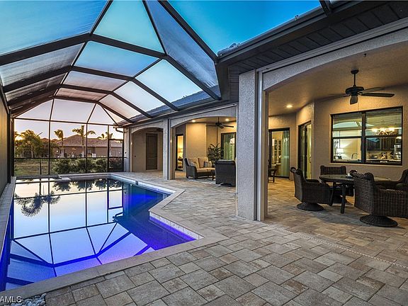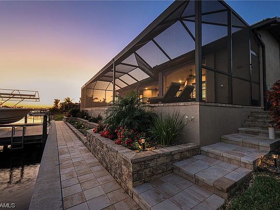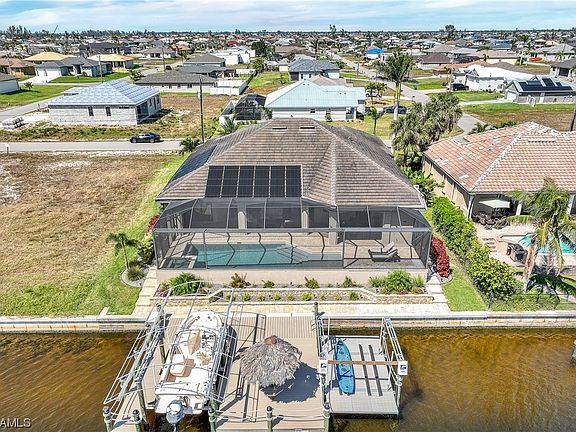 Click tour to see cinematic video & 3D floor plan. In the hottest area of Cape Coral, the owners spared no expense on this home. The 170’ wide SOUTHERN EXPOSURE canal has awesome VIEWS & QUICK ACCESS to open water. The dock is amazing with a covered (on order) boat lift & a second kayak/jet-ski lift plus new tiki scheduled. Top quality includes impact windows, tile roof, paver driveway, AC transfer switch, nest cameras & surge protection. Inside you’ll find porcelain tile throughout, tray ceilings, custom cabinets, upgraded appliances, 2nd master suite, great laundry room, large office, custom window treatments. The lanai is huge with a saltwater autofill pool & spa w/solar & electric heat. Roll down Kevlar storm shutters to protect the furnishings, plus a pool bath & A/C storage closet for boating & pool gear. Lush tropical landscaping, new sod & Wi-Fi irrigation, new plants include banana tree, stone beds, paver walk end to end at dock & beautiful retaining wall & planting area. City water & sewer w/sediment & carbon filters + softener outside and an RO inside. ALL ASSESSMENTS PAID. Available Turnkey. The lot next door also available MLS # 223020044 Assumable flood policy saves $