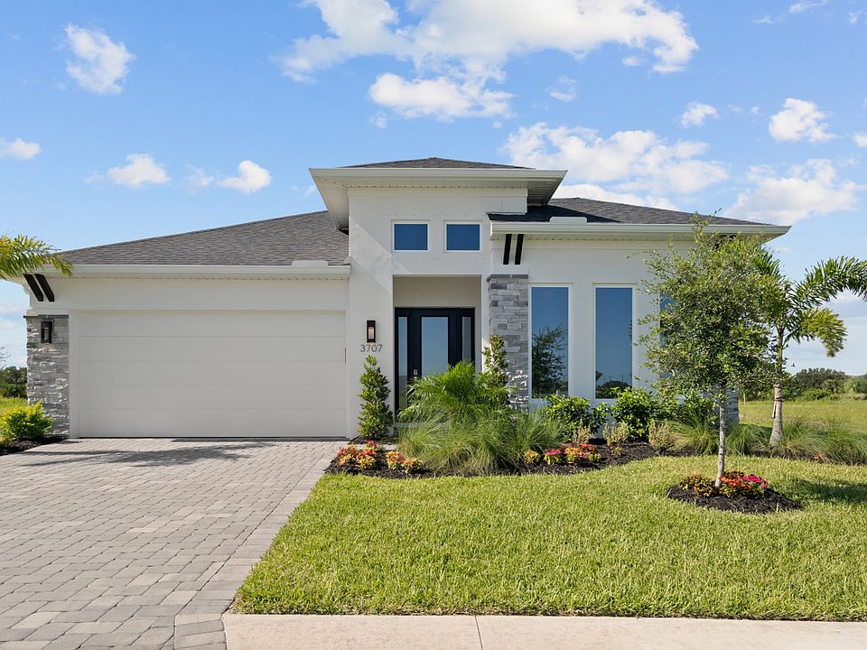 Step off the front porch and into a welcoming entryway with an extended tray ceiling that embraces the main hallway. French doors open into a secluded home office that overlooks the front yard. A full guest suite with a private bathroom and ample closet space is off the main hall. The kitchen features an island with built-in seating, and corner walk-in pantry. The dining area flows from the kitchen to the connecting family room which offers plenty of natural light from its sliding glass door and access to the backyard covered lanai. The primary bedroom has three large windows overlooking the backyard space. Double doors lead into the bathroom which hosts dual vanities, a freestanding tub, glass enclosed shower, and two walk-in closets. Two secondary bedrooms and the laundry room complete the floor plan. The drop zone is located off the two-car garage. Representative Images. Features and specifications may vary by community.