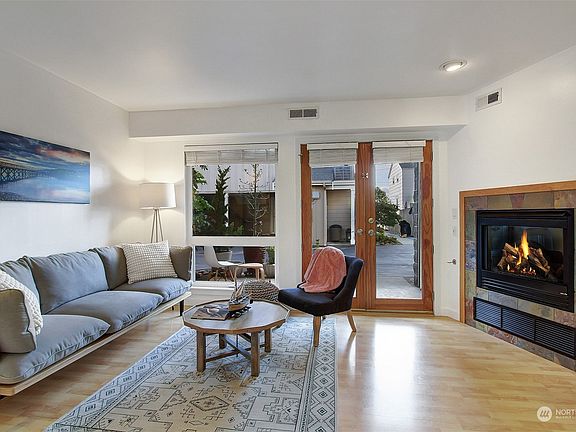 Beach lovers, rejoice! Here is the home you've been looking for, just steps to the beach at Cormorant Cove park and beautiful sunset views. This bright and light home lives more like a rambler, with no shared walls or stairs to navigate to your front door or back patio and French doors. You'll love the big primary bedroom and walk-in closet, plus the 2nd bedroom large enough for a queen bed. The living room features sunny windows and a cozy gas fireplace for those chilly Seattle days, and the dining room accommodates a full size dining table. With a a newer in-unit washer and dryer and a private patio, plus designated covered parking next to the home and a large storage unit, this home has it all. Responsive HOA & friendly neighbors!