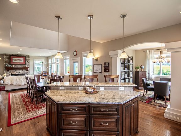 This custom built home features an amazing view over a coulee (with hiking or biking trails!) and no back yard neighbors! From the moment you walk in to the 2-story entry, you will see an abundance of natural light. The kitchen is equipped with cherry cabinets, granite countertops, island and tons of storage including built-ins and extra work space along with a large pantry. Cooking will be a breeze with the Bertazzoni gas range a brand new dishwasher! There is plenty of room for hosting friends and family with the large dining area, in addition to the separate breakfast nook! The living area offers expansive views through the large windows and features a gas fireplace. You will be sure to appreciate the large mudroom with tons of built-ins for shoes/bags along with the laundry area which contains storage and a sink There is also a 1/2 bath and an office with built-ins on this level. Up the grand staircase you will find the perfect primary retreat. Stay warm with the gas fireplace and enjoy sunsets on the balcony of the primary suite. The bathroom has dual vanities, a large tiled shower, whirlpool tub along with a separate toilet room and a walk-in closet. There are 3 additional bedrooms, 2 full bathrooms (one with dual vanities) and an extra sitting area with built-ins on this level! Downstairs you will enjoy entertaining in the large family room with a gas fireplace, wet bar and walk-out access to the patio. Additionally, you will find Bathroom 5 with dual vanities and separate shower/toilet room and 2 more bedrooms with walk-in closets. One is currently being used as a craft room, and even has a sink for easy clean up but can easily be converted back to a bedroom. The garage is heated and has bright lighting and epoxy floors along with floor drains and water. And wait until you see the rock-climbing wall! Out back is a fire pit area, along with 2 garden areas! Bonus features include a new water heater, roof in 2023, granite countertops throughout, some automated blinds, a Generac automated stand by generator, hot water recirculater with timer, garage hardwired for 220, and water access at the garden! Call your favorite agent today for a showing of this luxurious home that is sure to check all the boxes!