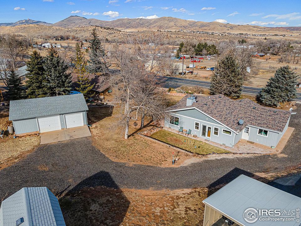 Nestled in the picturesque foothills of Loveland off Highway 36 and on the way to Estes Park, this beautiful ranch-style home has been completely remodeled from top to bottom. Open concept floor plan offers a fantastic space for entertaining. Everything new as of 2020 including plumbing and electrical. 2.5 car detached garage with room for a workshop. New 30K gravel driveway ad culvert added in 2023 with additional access from Powderhorn Drive created with the 5th wheel traveler in mind. 50 AMP service installed at garage in 2022. Zoned Rural Residential 2 (RR2) which allows for a horse and up to 50 chickens. 15 minutes to town. The floor offers two family rooms - one with wood burning fireplace and opens to the back patio; a large kitchen with custom Milarc Alder cabinetry with self-closing doors and extra deep pots and pans storage, a 22sf center island and breakfast bar, Kraus farmhouse stainless steel sink, Quartz countertops, luxury vinyl plank flooring, a large pantry with pull-outs,stainless steel appliances (brad new refrigerator) and coffee bar station; an oversized primary bedroom suite with a private entrance to the full bathroom and walk-in closet; 2 conforming secondary bedrooms (1 without a closet could be a study and is currently being used as a dressing room/closet) and a guest bedroom wing with conforming bedroom and 3/4 bathroom. The original house was gutted in 2020 and permitted reconstruction from the studs out and added structural supports in the crawl space and under the house.