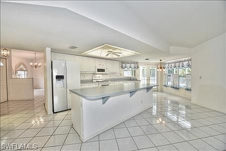 Open concept is exactly what this house is. The kitchen offers so much storage area, a huge Island and breakfast bar area. There is a formal dinning area as well as a eat in kitchen area. This is a three bedroom split floor plan with two bathrooms. The master bedroom has two walk in closets. The other two bedrooms also have a walk in closet. When looking out the kitchen window and master French doors you will see views of the large pool and private landscaped yard. The screened in lanai offers plenty of entertaining room as well as the large pool. The owner has kept up with pool maintenance, pest control outside, and A/C maintenance. This is the second owner of the home and it shows with how well kept the home is. There is also an orange tree on the side of the home. Come make this home yours.