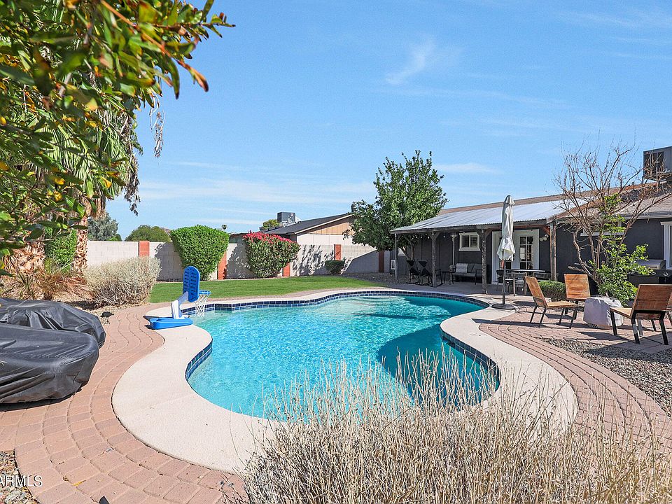 The heart of the home boasts an open living area that flows seamlessly into a kitchen that makes entertaining a breeze. But the true gem awaits outside! The spacious backyard is your private paradise, complete with a pool with newly redone Pebble Tec and ample space for lounging and hosting summer barbeques.