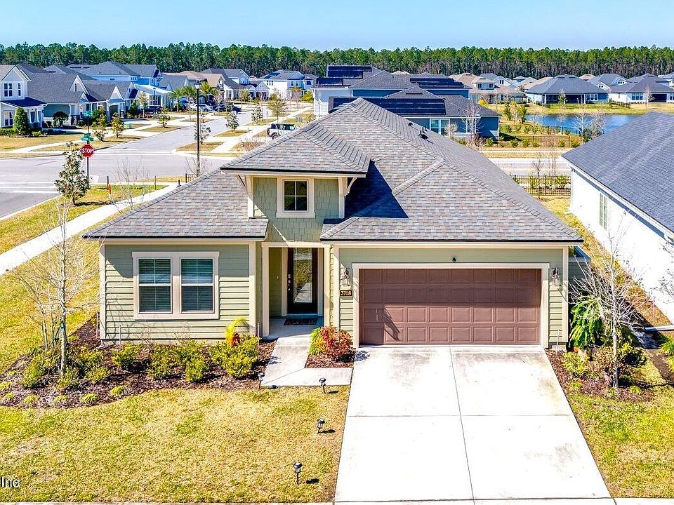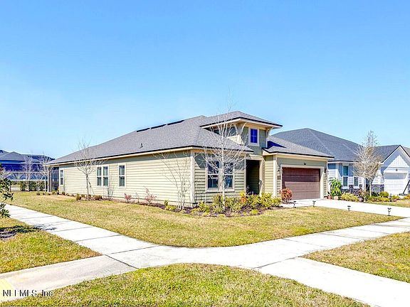 The living room features an electric fireplace and opens up to a screened-in spacious lanai with a view of the water fountain pond. The 2-car garage includes a built-in electric car charger and opens into a mudroom. Nearby amenities include a kids' play area within walking distance, a jogging trail, and a dog park.