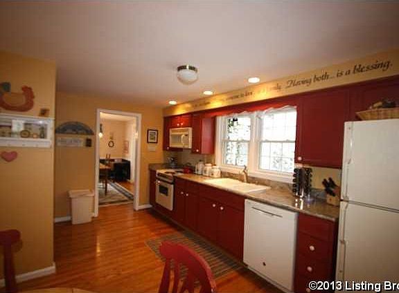Charming cottage like feel with hardwood floors through out most of the home. Glass french doors separates the living room from the foyer and dining room. The dining room has a door leading to a screened back porch that opens to a deck with built in seating and brick patio. The back yard is spacious with mature trees. The inviting kitchen has painted cabinetry, a spacious pantry, and opens to a vaulted ceiling family room with stone fireplace and built-in shelving. There is a cheerful half