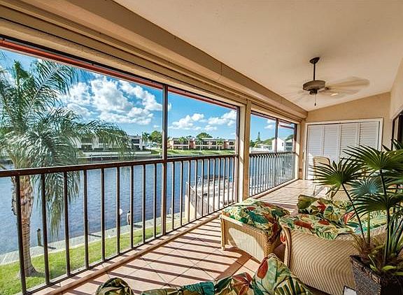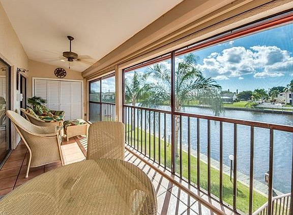 ENJOY GORGEOUS SUNSETS DAILY! Incredible views from your SW exposure lanai of the 200 foot wide Rubicon Canal with great Gulf access. Rare find in SE Cape Coral - a 2nd floor, 3 BEDROOM, CORNER unit with a DEEDED BOAT DOCK & 10,000 LB BOAT LIFT. This unit features high ceilings in the living space, arched doorways and GREAT VIEWS of the water from the kitchen, dining and living areas. Need a little shade? No problem! Kevlar screen provides STORM PROTECTION and SHADE on your lanai. GREAT LOCATION TOO, convenient to the SE CAPE CORAL ENTERTAINMENT DISTRICT as well as Historic Downtown Fort Myers. Condo units like this are hard to find. Hurry to take advantage of this great opportunity for a beautiful Gulf Access home in the SE Cape Coral area. Be sure to view the virtual tour that includes aerial shots of the Rubicon Canal. This is a 55 + complex. Call now for your private showing.