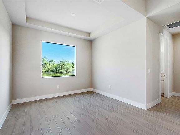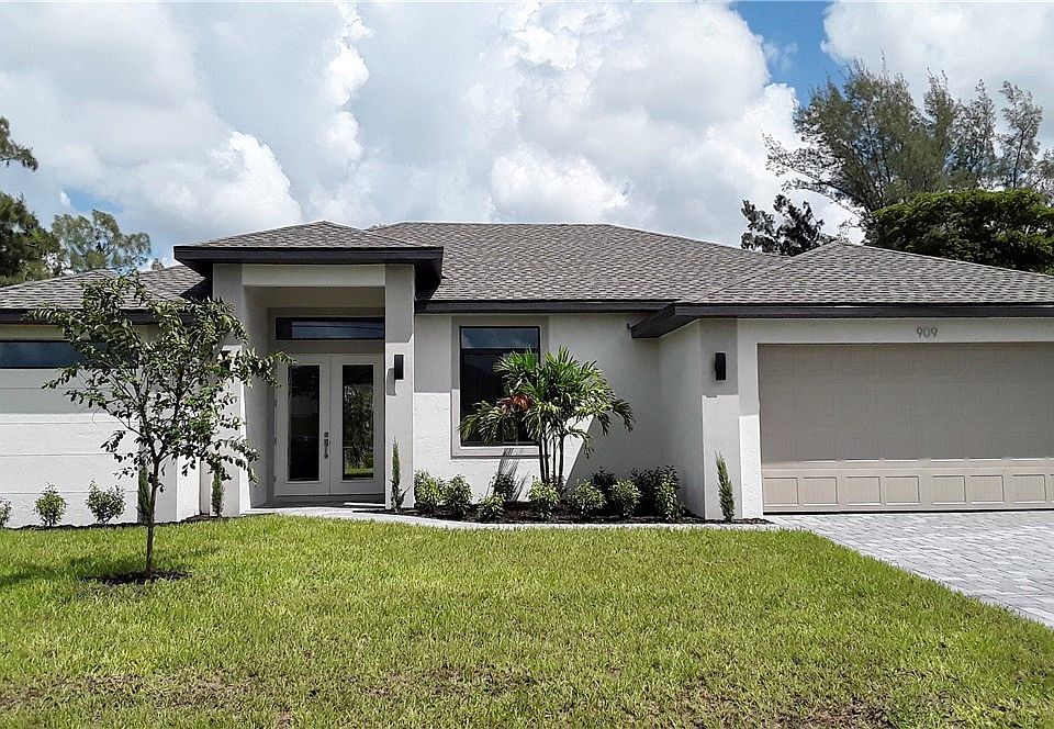 Completion September 2022. Best value and exceptional quality. New construction, luxurious contemporary home with plenty of room for a pool. This home is impeccably designed and built with attention to every detail. The open floor plan seamlessly blends indoor & outdoor living. Double entry doors welcome you into the light and bright interior. Expansive living room with high tray ceilings. The kitchen boasts gorgeous 42" solid wood soft close cabinetry with granite counter tops, a broad counter height island along with a stainless steel appliance package.The master suite welcomes you through the 8' doors (found throughout the home), tray ceiling and sliding glass doors into the patio. Large custom shower, garden tub, His & Her Sinks and separate walk in closets. The guest bedrooms are large with tall ceilings and ample closet storage. Beautiful Brick paver driveway and Front Walkway! Lanai with pavers, plumbing and electrical connections for outdoor kitchen. This Home is close to shops, restaurants, boating and THE BEST SW FLORIDA CAN OFFER.
