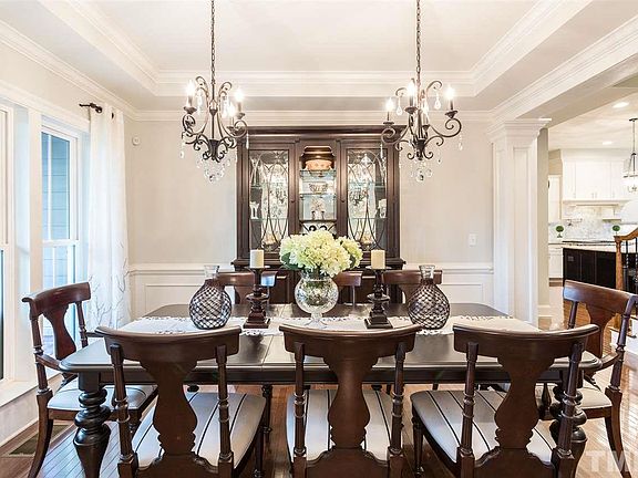 Spectacular West Cary Home! Covered front porch, 1st flr guest ste, large master ste upstairs w/dual WIC's, separate vanities. Chef's dream kitchen w/huge island,built-in SS appliances, double-oven, 2 dishwrs, butler's pantry, Wolf 6-burner gas cooktop/griddle, large pantry & bfast area. 2nd floor with 3 more BR's, 2 full baths & large rec room w/built-in desks. 3 car side load garage,flat drive,elegant back porch w/dual-sided fplace & stone patio! Culdesac. Professionally landscaped. Smoke/pet free home.