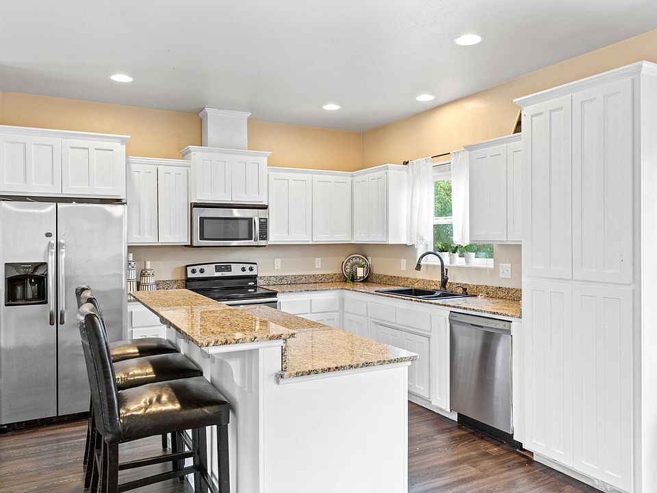 Like New, very nice 3Bdr, 2 1/2 Bath family home with desirable open floorplan. Spacious Living Room opens to well laid out Kitchen with Island, Bar Seating and Dining Area! Gorgeous wood-look laminate flooring! Beautiful Granite slab counters, Stainless Appliances, recently painted cabinets and fresh Interior Paint throughout. Master Bedroom is downstairs with bathroom ensuite and large walk-in closet. Indoor Laundry with storage and Half Bath complete the main level. Upstairs offers 2 great sized Bedrooms and Bathroom. Granite counters in all bathrooms! New carpet in all bedrooms and laminate in bathrooms. Slider leads to patio with fresh sod in the backyard. Lots of windows providing much natural light throughout, and neutral colors for that modern feel. Refrigerator and Washer/Dryer stay! Attached 2 car garage. Tons of curb appeal on this corner lot home! Come tour this home before it's gone!