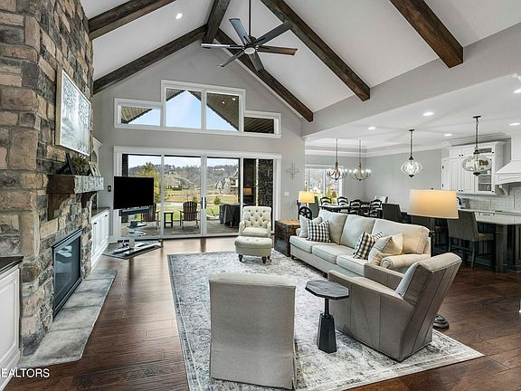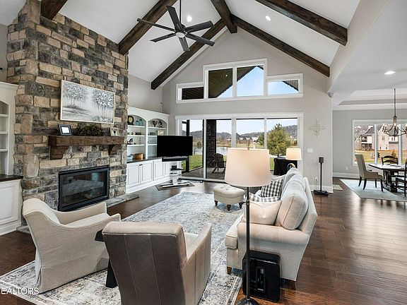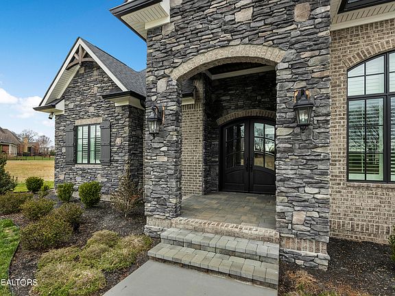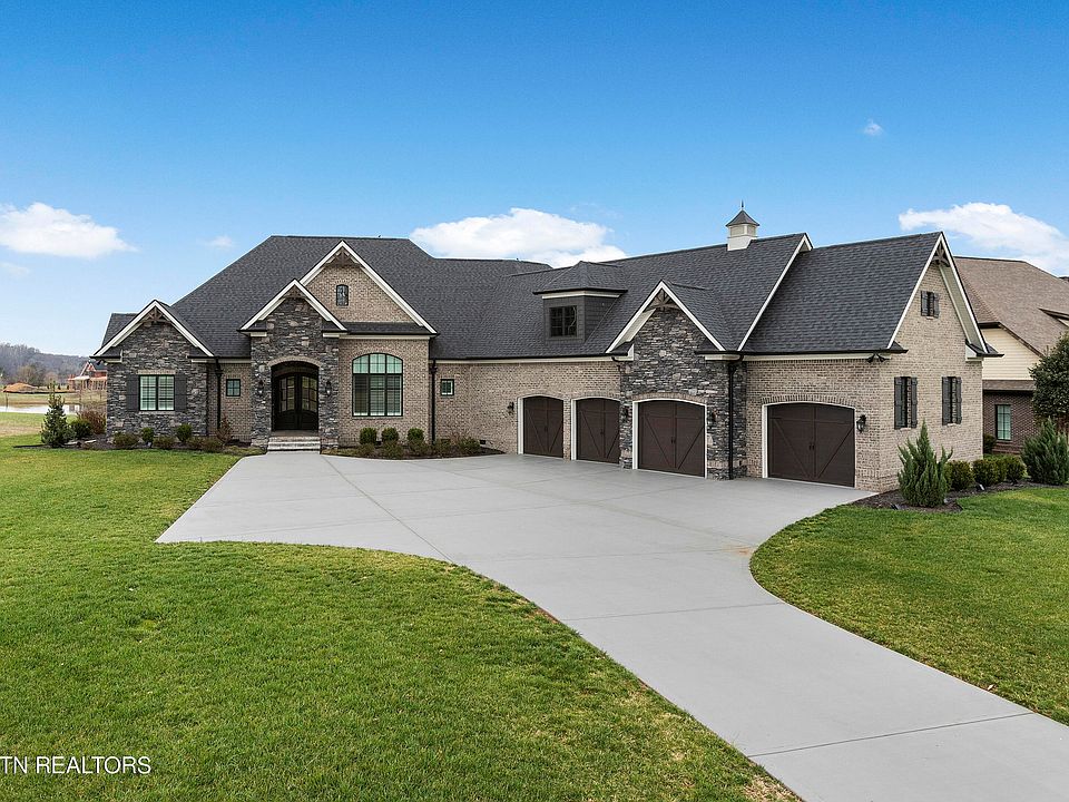 This beautiful ranch style custom home constructed of brick and stone by Providence Builders in 2020 offers an incredible opportunity to live in the highly desirable lakeside community Lashbrooke. Off of a covered front porch and through a pair of French doors, guests and family alike are welcomed into a home where rich hardwoods, a vaulted ceiling, exposed beams and water views are showcased upon arrival. The main living space boasts custom built-ins and a stone fireplace with beautiful views and access to the covered back patio. The open floor plan allows seamless access to the eat-in kitchen where an island, stainless appliances, double oven, wine fridge, and plenty of counter space await. The primary suite is spacious and has ample natural light plus a trey ceiling for some added interest. A large bath with an oversized walk-in shower, soaking tub, double vanity, and large walk-in closet help complete this suite. The main level is rounded out with two additional bedrooms with a Jack-n-Jill bath; a home office with a coffered ceiling, wainscoting, and an oversized window for ample natural light; an oversized laundry room; and a mud room for backpacks, shoes or shopping bags. Upstairs is a spacious bonus room which can be used as a playroom, media room or additional living space. The covered back patio with wood-stained gables boasts views of the community stocked pond/lake water feature along with ample space to watch sunsets or dine al fresco. Mere steps further is additional patio space which is uncovered and has a smokeless fire pit that will surely be enjoyed year-round. With a community clubhouse, neighborhood dock and more while in close proximity to Knoxville shopping, dining and entertainment this home will surely delight.