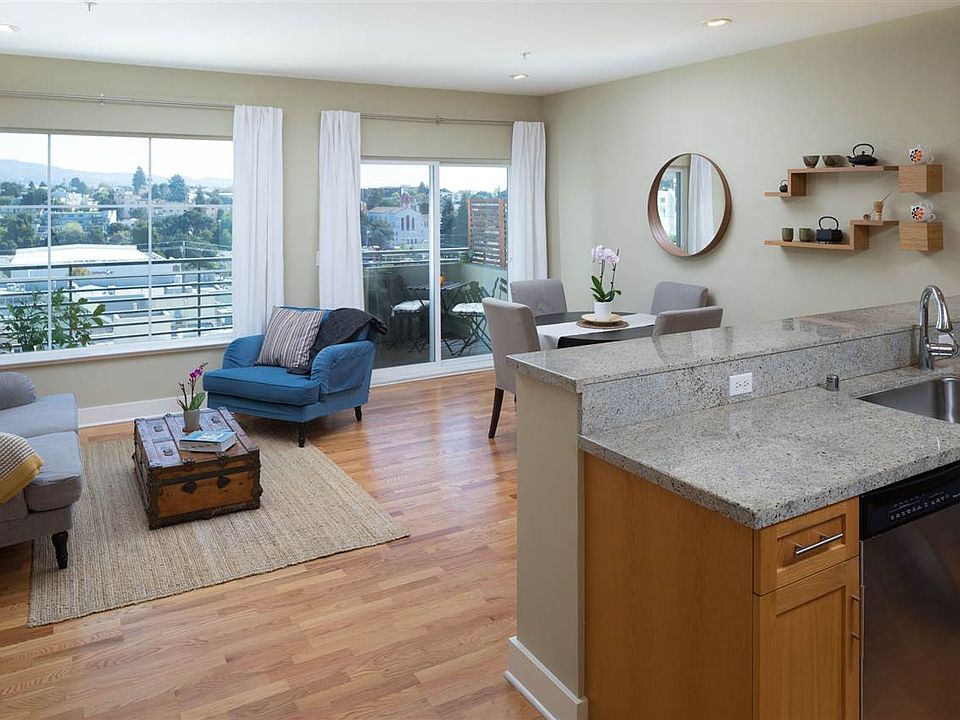 Once you step into this bright, sunny, top-floor condo you'll know you are home. Boasting a gracious wide open floor plan complete with Oak hardwood floors, granite counters, stainless steel appliances, contemporary bathroom, and especially rare in unit washer/dryer this home has everything. Take a step outside to your own sizable, private balcony and enjoy the morning sun, twinkling Mormon temple in the Hills, or sit and watch the full moon rise over the Town through your oversized picture window. Roll out of your bed and make your way downstairs to pick up your morning coffee or tea from the family run Cafe Roma. You will appreciate the design of this building completed in 2004 by famed architect Toby Levy as it sits high atop Pill Hill. Feel right at home in this cozy 26 unit building where you'll receive a smile from your neighbors, take part in the annual food drive, or visit an art installation of one of your neighbors. **OPEN HOUSE Sat/Sun 10/20 & 10/21 from 2-4:30pm**
