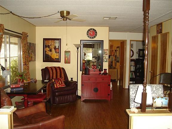 Updated mobile home w/ laminate flooring, ceiling fans, freshly painted, newer appliances, high beam ceilings in living room, private patio side & backyard, outside storage, shed w/power. Buyer to verify square footage, bedrooms and bathrooms if important. Square footage was calculated using the overall length and width of the manufactured home.