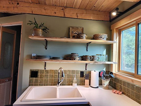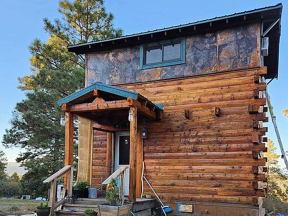Beautiful 400 sf Tiny Cabin fully furnished and ready for a weekend get-away or long-term rental. Just 7 miles west from City Market. Quiet with Beautiful views of the San Juans Mountains to the north; and Broken Off Point and Billy Goat Summit to the south. Full size bathroom with a really deep soaking tub along with towels. Many modern conveniences like Hot-Water-on-Demand, all Chrome Fixtures, Washer/Dryer, Microwave, Air Conditioning for those rare hot afternoons. A very comfy full-size Murphybed along with flannel and summer sheet sets. When tucked away it leaves a very spacious 12' x 16' sitting area. Two closets and 3 small dressers. Ceiling Fan, Gas Stove. TV is wall mounted and can be pull out to watch in bed. Writing table and book shelf for your favorite books. Fully equipped kitchen with undershelf track lighting, new pans, storage containers, cooking & eating utensils. Enjoy an additional 417 sf area. You decide if it's a greenhouse, workshop, studio, or sunroom. Additional 100 Amp service; 30 Amp RV hookup; and outside outlets. If your interested in a little homesteading, you'll be all set up with chicken coop, two garden areas: 8' x 20' fenced in area and a 4' x 8' raised garden bed. Your Oasis in the mountains awaits. And with no city lights so you see the stars.... Shown by appointment only. Must provide pre-approval for loan or letter from bank if all cash. Not included - artwork, spices & jar dry food, and personal content.