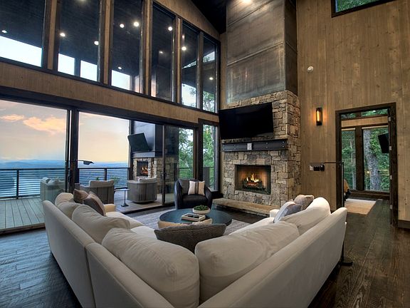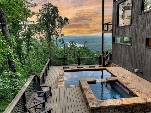 Head in the clouds and drifting away on mountain time bliss -- welcome to "Whiskey 'n Sunshine!" Overlooking layered mountain and Lake Blue Ridge views, this brand-new contemporary rustic chalet boasts walls of glass, unique architecture, and timeless mountain getaway touches! With soaring cathedral ceilings and an open-concept layout, each bedroom and living spaces on both levels open up to spectacular scenes. The living room is complimented with a grand stone and steel fireplace; a gourmet kitchen and eat-in gourmet island creates the perfect entertainer's home. Outdoor kitchen and custom corner fireplace on the exterior blends and brings together both the indoor and outdoor living. Large king bedrooms are accompanied by ensuite baths complete with large walk-in tile showers, custom vanities, and designer touches throughout. On the terrace level, find a full wet bar, billiards area, den and walk-out terrace deck. Meander over to the mountain-zen stone saltwater pool and overflow jacuzzi overlooking the best views in North Georgia. Sold fully-furnished with brand-new Restoration Hardware furniture and located in highly sought-after Necowa Cove complete with deeded access to Lake Blue Ridge, minutes away from the Appalachian Trail and other hiking and biking trails, the Toccoa River and Downtown Blue Ridge! Call today for an exclusive tour of this bespoke mountain retreat.