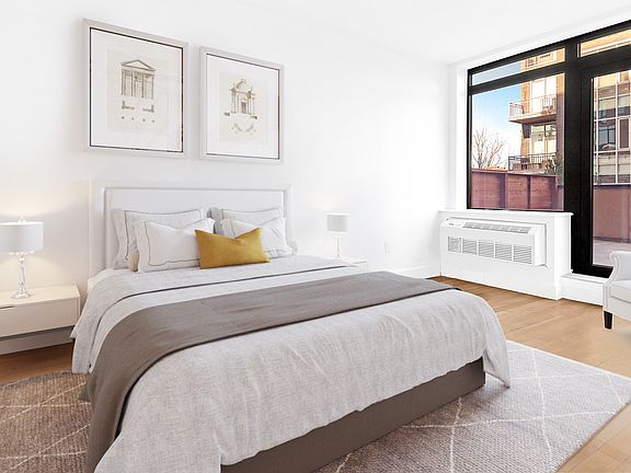 This beautiful sun-filled two-bedroom features an open layout, a fully renovated kitchen with breathtaking views of Manhattan and a spacious private terrace!! Make yourself at home at this luxurious new development in Williamsburg. 371 Humboldt is everything you could ask for in full-service living; friendly staff, state-of-the-art gym, relaxed recreation room, stunning rooftop with a 360-degree view, to name just a few of the amenities this building has to offer. Located steps from the L train stop Graham Ave, access to Manhattan and the rest of the city couldn't be easier, but with all the restaurants, shops and bustle of Williamsburg, residents will have little reason to leave. This unit boasts fantastic natural light and striking views complimented by solid oak floors. Each bedroom has its own PTAC unit, allowing occupants the ability to control their room's environment. Laundry in the unit saves you the trip downstairs or across the street and if you've not been had that before, you'll quickly wonder how you could live any other way. Photos are of a similar unit in the building.