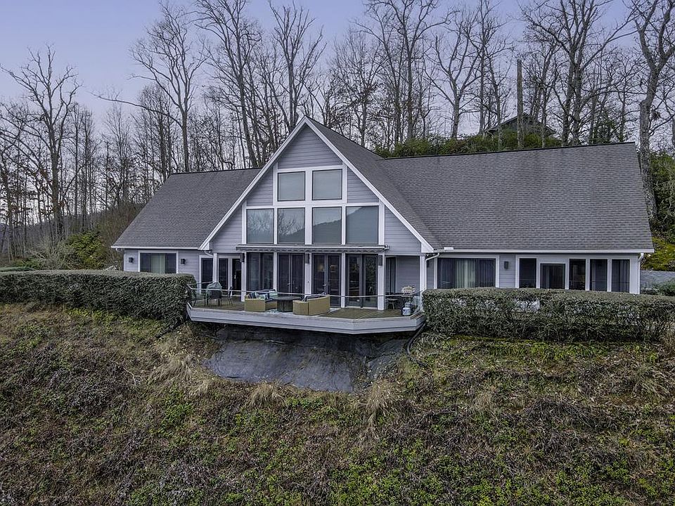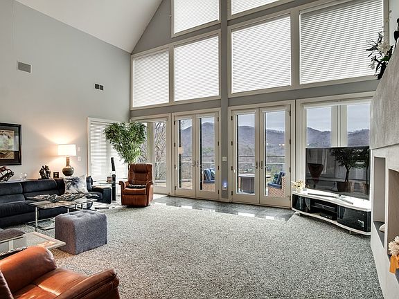Beautiful contemporary home offering end of the road privacy with exceptional mountain views. Front deck features glass railing opening long range views throughout the entire home. Spacious living room with 27' vaulted ceilings, floor to ceiling windows and open floor plan throughout the kitchen and dining room. Double sided gas fireplace facing the living room and office area. Kitchen offers Corian countertops, ceramic backsplash, dual stacked convection oven, island with conduction stovetop, and tile flooring. Split bedroom plan with large primary bedroom on the southeast side of the home, includes private deck, en suite bathroom, walk in tile shower, freestanding tub, two separate vanities adding space and storage. The two guest bedrooms located on the opposite side of the house each have private bathroom access, and shared screened porch.