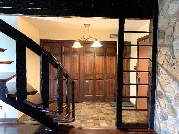 One of a kind home nestled on 3.50 acres! You are welcome by Slate Tile, Stone Walls, Beautiful Woodwork, & an enclosed Wet bar. Living room boasts floor to ceiling stone fireplace, patio overlooking the property & hardwood floors lead into the casual dining area, & kitchen with powder room adjacent. Kitchen updated with Slate Tile, & Concrete Counters. Laundry on the main, with a family room and patio leading to expansive backyard, 2 bedrooms, each has walk-in closets, & share a full bath. Up the unique spiral staircase is the Master Bedroom, with gorgeous lofted ceilings, Office Built-ins, & currently used as a family room with another deck overlooking the property. This space features a luxurious walk-in closet, & master bathroom with Inset Jet Tub. The lower level is finished, & equipped with full bath, Sauna, Murphy bed, more storage, & access to the 2 car garage. Mancave used as extra Game room/Gym heated with its own driveway. Tennis Court updated with commercial Lighting